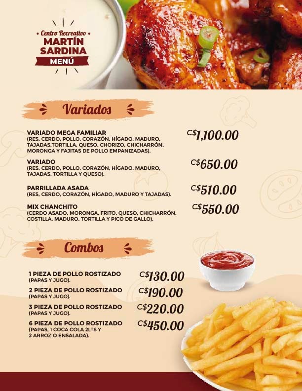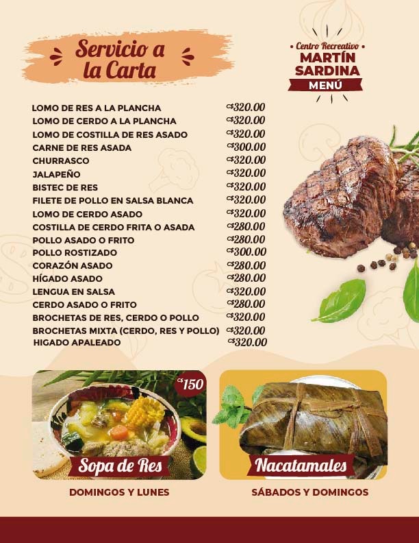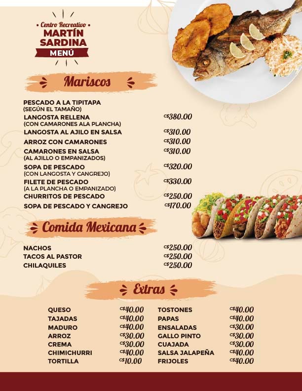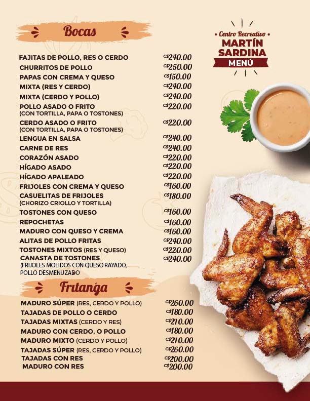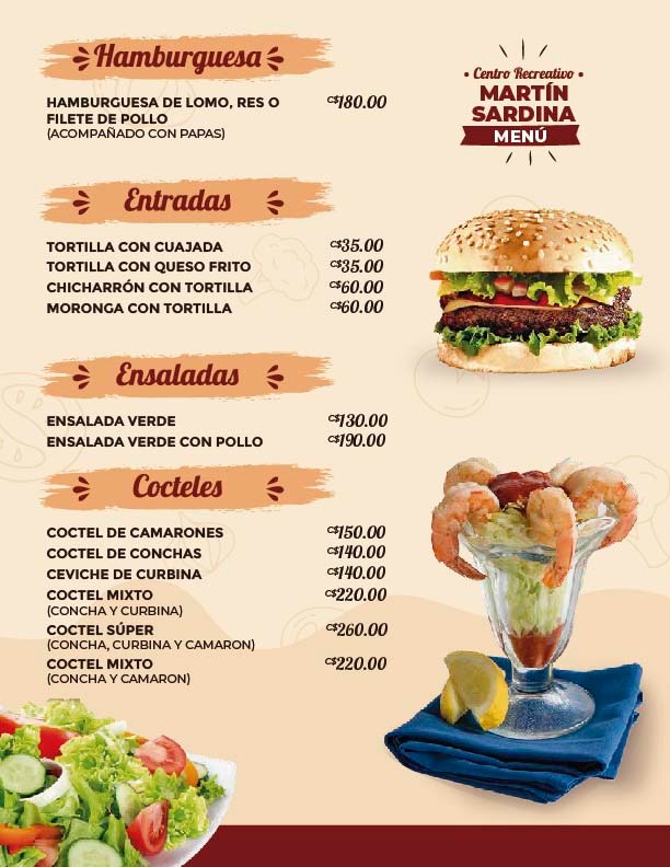 At Restaurante Martin Sardina (NIC-2, Jinotepe, Nicaragua), the menu feels like a compact tour of Nicaragua’s comfort food and coastal flavors, wrapped into a few clear categories that make ordering easy. If you’re craving something warming and traditional, the soups section sets the tone with Sopa De Pescado, Cangrejo, and Sopa De Res-the kind of hearty, familiar choices that work whether you’re stopping in for a quick meal or settling in for something more filling. The main “Item-Menu” leans casual and satisfying, mixing straightforward bites like Hamburguesa De Res with local-style plates such as Boca Criolla, Tajadas Con ResTajadas Con Costilla Fritas, and Chilaquiles, offering a nice range from snackable to seriously substantial. For groups (or hungry appetites), the “Mega Variado” options-Mix Chanchito, Mega Variado Para 9, and Mega Variado De 4-signal generous, share-friendly platters that are built for variety rather than just one flavor. And if you want something bright and fresh, the ceviches stand out as the seafood showcase: Ceviche De Pulpo, Ceviche De Camarón, and Ceviche De Corvina. Overall, it’s a menu that balances warmth, crunch, and citrusy freshness, making it easy to build a satisfying meal whether you come solo, with friends, or as a big table looking to sample a little bit of everything.